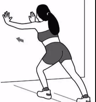 推墙5次:双手推墙5次,同时腹部和臀部用力,后腿的膝盖、脚腕后侧伸展绷直。推墙时脚后跟不要跟着动。