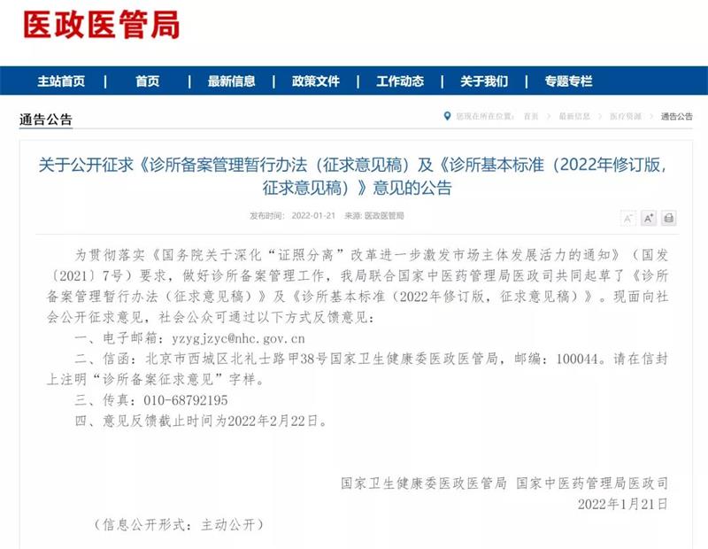 近日,国家卫生健康委医政医管局联合国家中医药管理局医政司发布《诊所备案管理暂行办法(征求意见稿)》及《诊所基本标准(2022年修订版,征求意见稿)》,要求个人举办诊所,须取得执业医师资格,经注册后在医疗卫生机构中从事同一专业的临床工作满5年;两人及以上合伙举办诊所的,所有合伙人均应当符合上述要求;法人或者其他组织举办诊所的,诊所主要负责人应当符合上述要求。