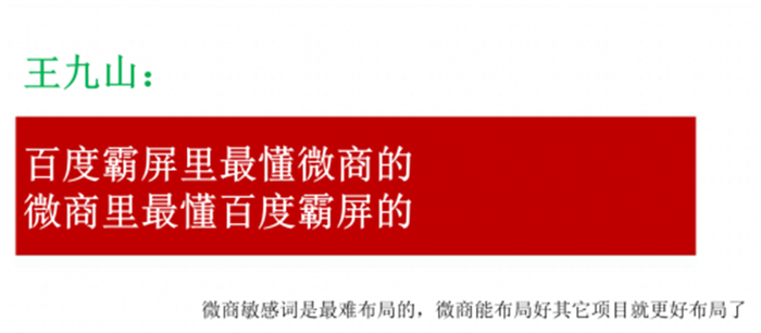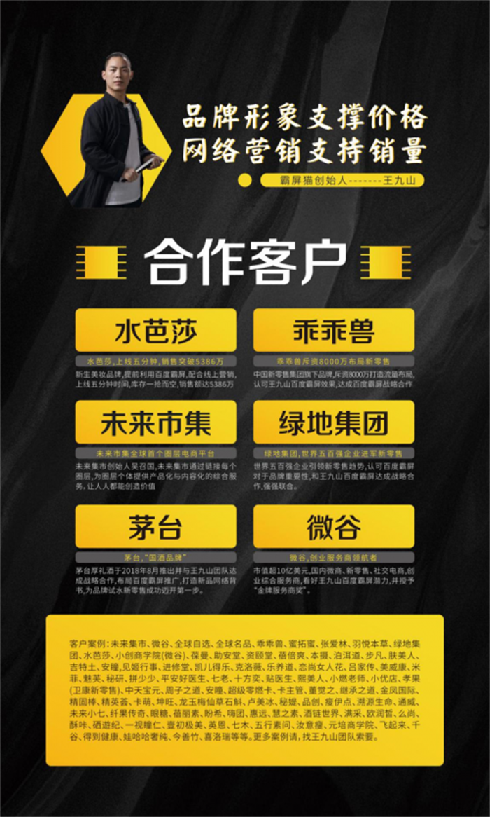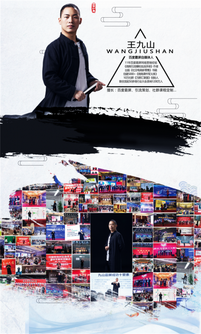 王九山在这个领域做的算是风生水起,一开始我对他并不熟悉,只是知道有这个人,对他比较关注的是很多行业大会邀请他作为分享嘉宾,很多行大会大事件的海报底下都有写“媒体支持:王九山百度霸屏团队”,除此之外,我的很多客户都在和他合作百度霸屏网络布局业务,王九山也是我们“触电会”的老会员,再加上我的深入了解,我也就很放心的把他推荐给大家,毕竟专业的事情还是要找专业的团队来做。这里除了介绍王九山百度霸屏团队成功的15大原因之外,也给大家普及一些网络相关的认知,让大家做的百度霸屏发挥到最大价值,另外告诉大家,不管是微商还是传统品牌,一定要具备“互联网思维”。