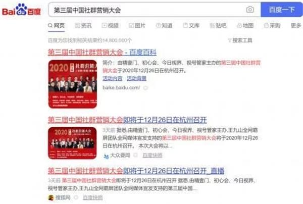 据悉,由精壹门创始人老壹老师联合王九山全网霸屏团队打造的第三届中国社群营销大会将于2020年12月26日在杭州召开。本次大会由精壹门、初心会、今日视界、视号管家主办,王九山百度霸屏团队提供全网媒体宣发支持。