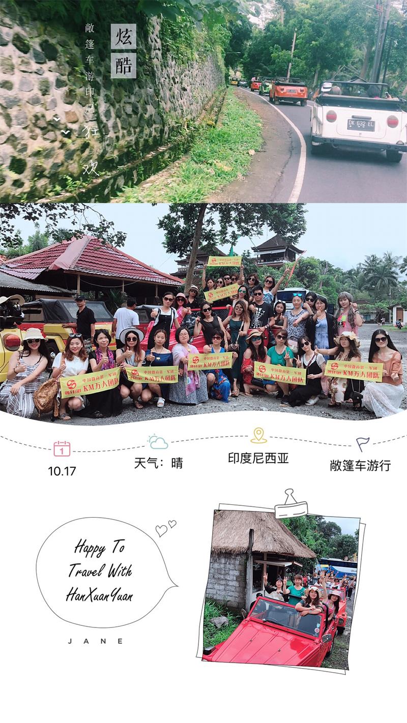 在巴厘岛之旅中,韩轩缘的代理们驾驶着敞车,在公路中疾驰,感受路上拂面而来的凉风,看着路上山峦起伏、有险峻的河谷,无疑体验了一把肆无忌惮的自由自在。据悉,这是韩轩缘代理们继7月份的七彩云南游的第二次豪华游。全程公司包吃包住包机,实现了许多代理第一次出国,第一次坐飞机的梦想,也第一次见证了她们的微商成果。