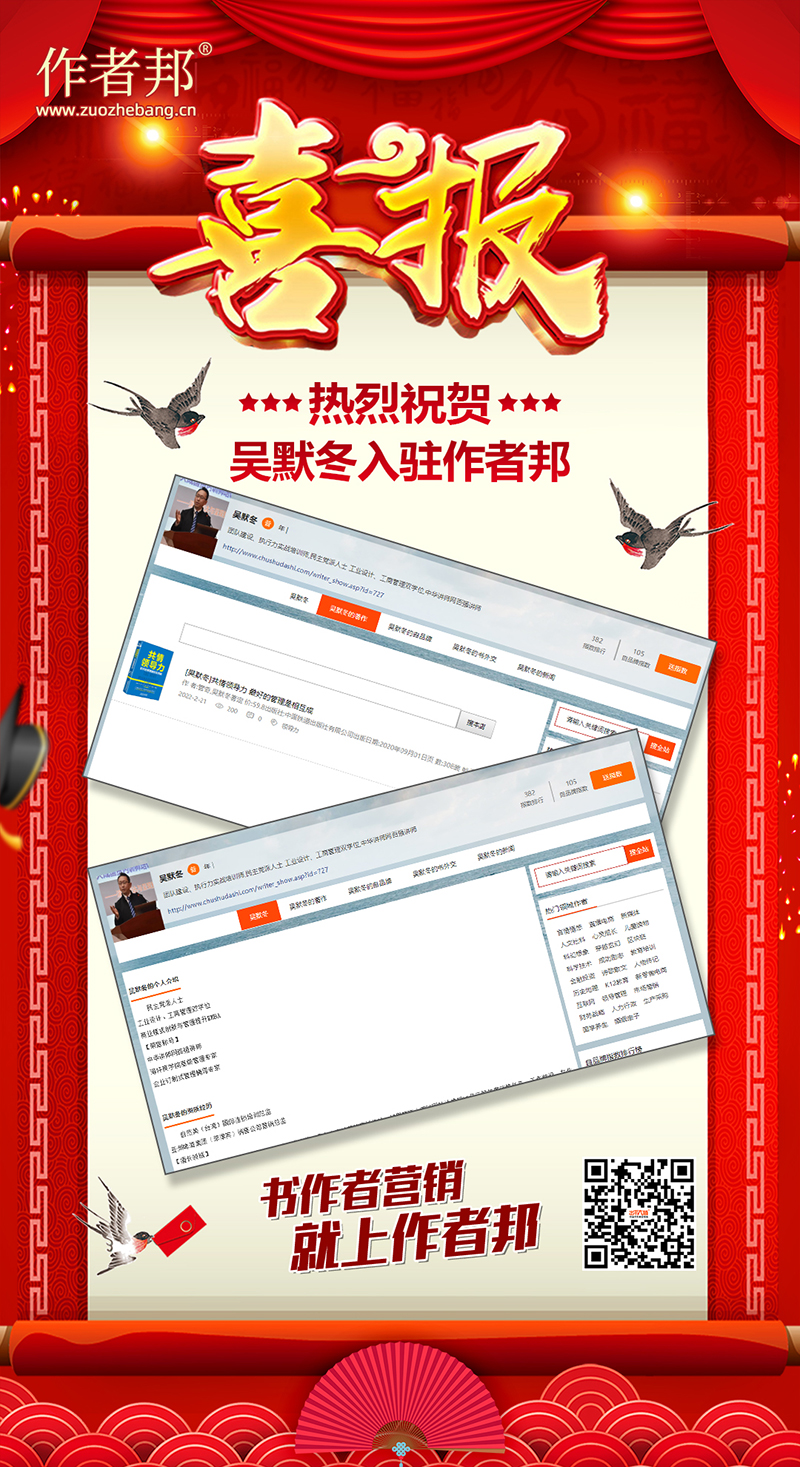 近日,海轩商学院高级管理专家吴默冬老师,正式入驻中国书作者营销平台作者邦,有效地呈现出他在商业管理培训行业的综合影响力。对于吴老师的入驻,作者邦表示真挚的祝贺。