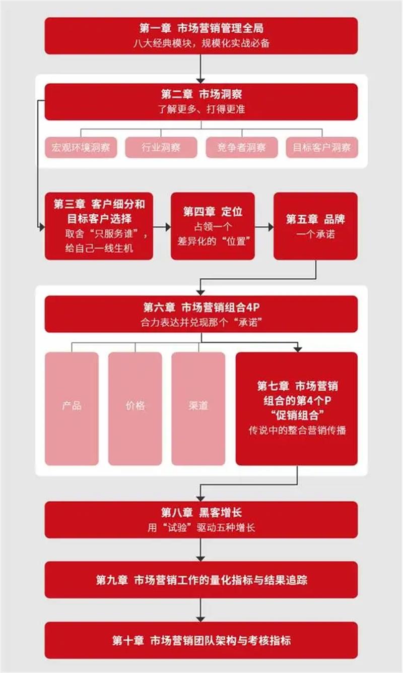 《极简市场营销》这本书给出了明确的答案和实战建议。全书以短短300多页将市场洞察、客户细分、目标客户选择、定位与品牌、市场营销组合、量化指标与结果追踪、团队架构与考核指标、黑客增长这8大市场营销经典模块,简练的通过“是什么、为什么、怎么做“讲解得通俗易懂。