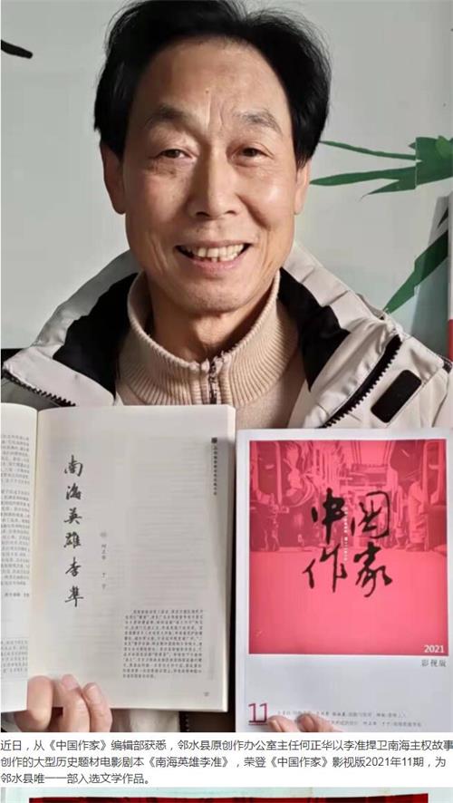 近日,从《中国作家》编辑部获悉,邻水县原创作办公室主任何正华以李准捍卫南海主权故事创作的大型历史题材电影剧本《南海英雄李准》,荣登《中国作家》影视版202111期,为邻水县唯一一部入选文学作品。