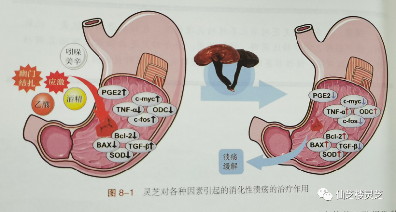 研究表明,灵芝子实体的乙醇提取物可改善隔日酒精引起的SD大鼠胃溃疡症状,降低胃粘膜损伤指数,抑制粘膜损伤和局部充血。