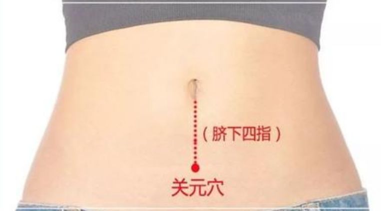 关元穴在哪儿呢?在下腹部,身体的正中线上,脐下3寸。采用仰卧的姿势,将手四指并拢,置于脐下横量,在手小指的下缘处即是该穴。