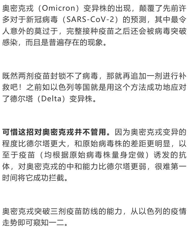 以色列在2021年11月底发现境内首宗奥密克戎确诊病例时,全国打完三剂疫苗的人口已超过一半,奥密克戎还是用飞快的速度全境扩散。