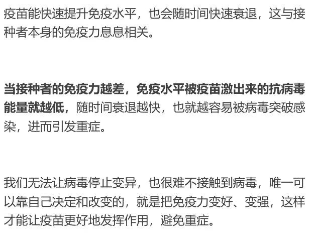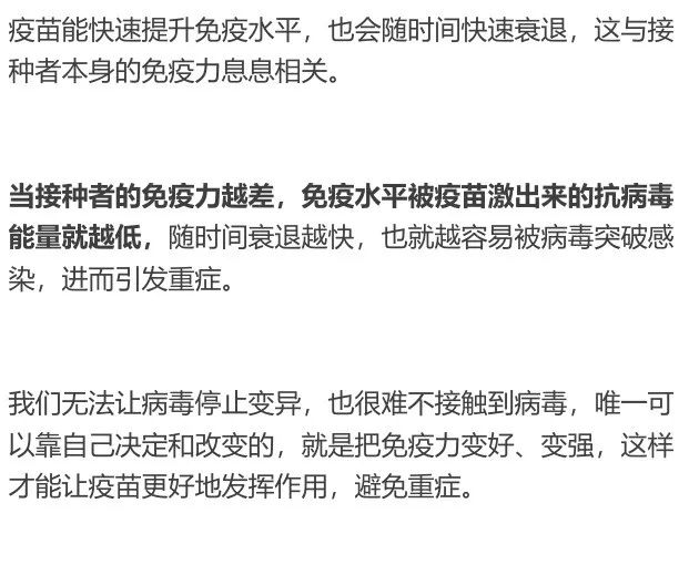 疫苗是快速提升免疫水平的好方法,但是疫苗的效果会受原本的免疫力影响。免疫力越好,疫苗激发的免疫水平就越高,被疫苗提升的免疫水平随时间衰退的幅度也越小,可以避免感染和病发重症的能力也越好。