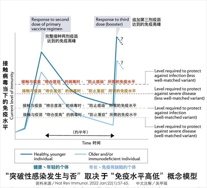 是否会发生突破性感染,以及是否会因为感染而病发重症,取决于接触病毒当下“免疫水平”的高低。
