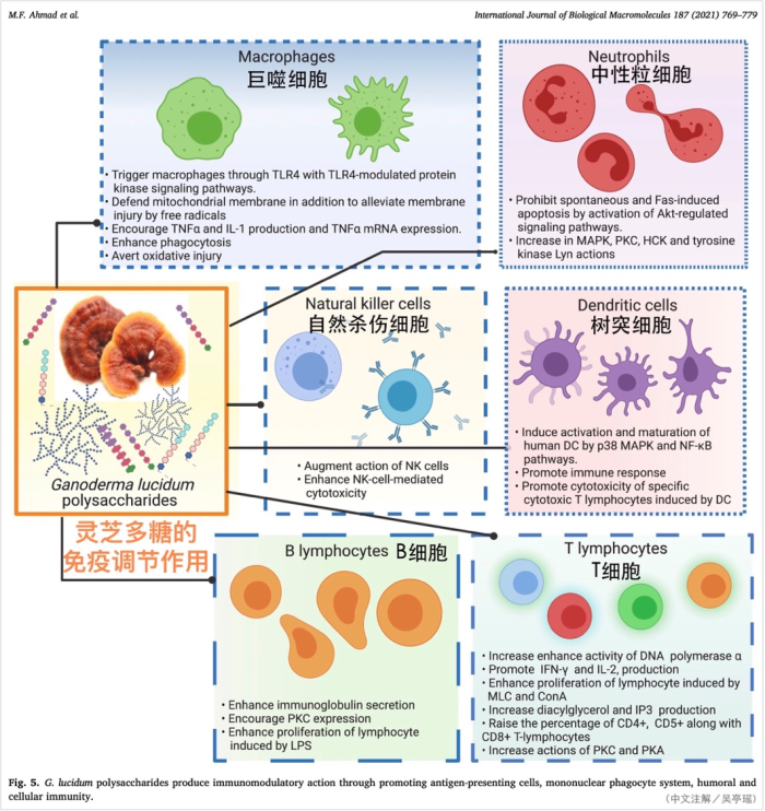 2021年9月《International Journal of Biological Macromolecules》(国际生物大分子杂志)刊登了一篇来自沙特学者的文献回顾,根据目前已知的科研成果,将灵芝活性多糖有助对抗病毒感染的免疫调节作用,做了详细的整理(如下图):