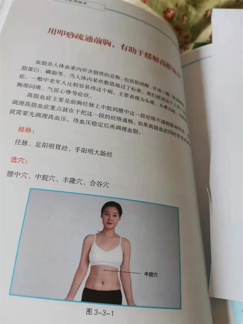 在中老年经络调养方面,《康养实用技术》介绍了针对糖尿病、面瘫、高脂血症、胆结石、支气管炎、肺炎、胃炎、脑血栓、胆囊炎、哮喘等调养之法。比如胆结石,可以电疗按摩期门穴、阴陵泉穴、太冲穴,丘墟穴;食疗上,也可用金钱草利胆粥。高血脂也主要是前胸任脉上中脘到膻中的这一段经络不通所致,所以,调理高脂血症主要是让这一段的经络通畅。如果伴有高血压,就需要先调理高血压,待血压稳定后再调理血脂。