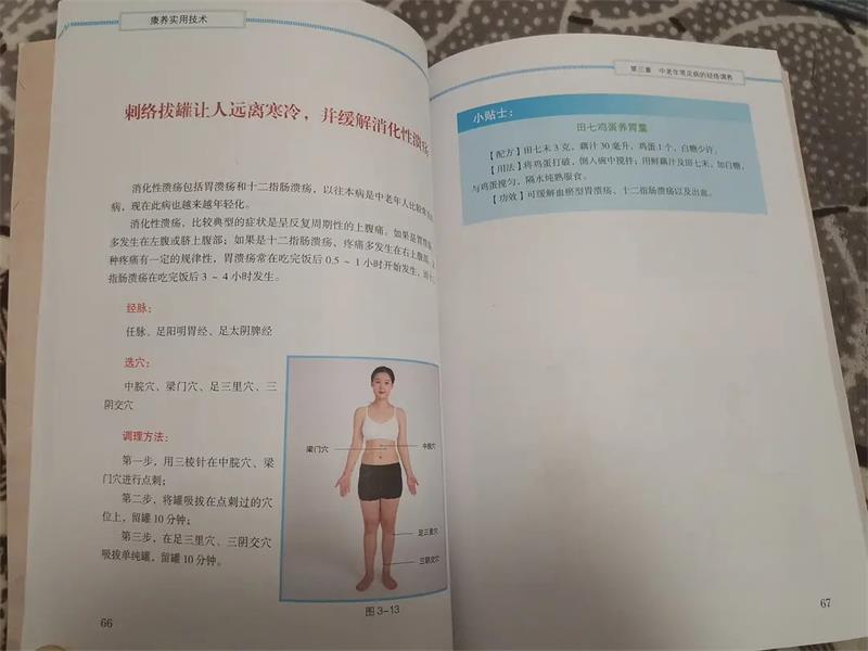而后,作者针对各类人群及相关常见病,都提供了对相应的经络,如何进行保养的各类相对简单、容易操作的初级治疗或缓解方式,比如针灸、拔罐、刮痧、推拿、食疗、艾炙(或将其中几种方式结合起来获取更好治疗效果的保养方案)。比如在治疗中老年人中常见的消化性溃疡一篇里,作者首先简述了该病的主要症状,然后指出病症所在的经脉,可以施针的穴位,再提出可以用三棱针和拔罐结合的方法调理,最后,还在每一篇末尾都有的小贴士里,提到可以缓解此类病症的“田七鸡蛋养胃羹”的配方、用法和功效。