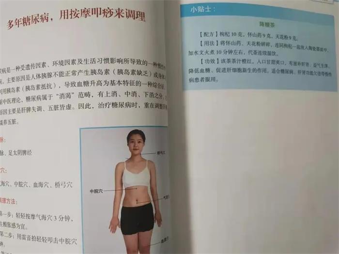 像糖尿病,作者介绍了按摩与叩痧的方法来调理。经脉:任脉、足太阴脾经。选穴:气海穴、中脘穴、血海穴、桥弓穴。方法:轻按气海穴三分钟,以产生酸胀感为宜;用雷音拍叩击中脘穴三分钟;用力按压血海穴二分钟;按摩左右两侧桥弓穴,每侧按三分钟。同时介绍了降糖茶,非常简单的配方:枸杞、怀山药与天花粉。