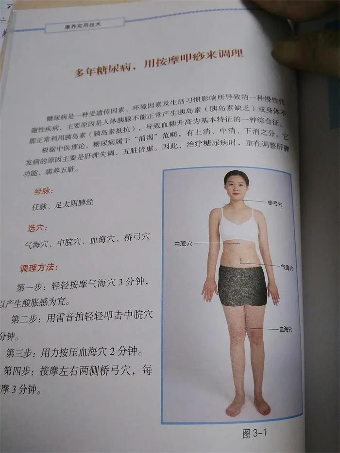 第三章至第八章分别对中老年常见病、儿童常见病、妇科疾病、男性疾病、人体亚健康、美容美体等进行经络调养详细讲解。拿糖尿病为例。