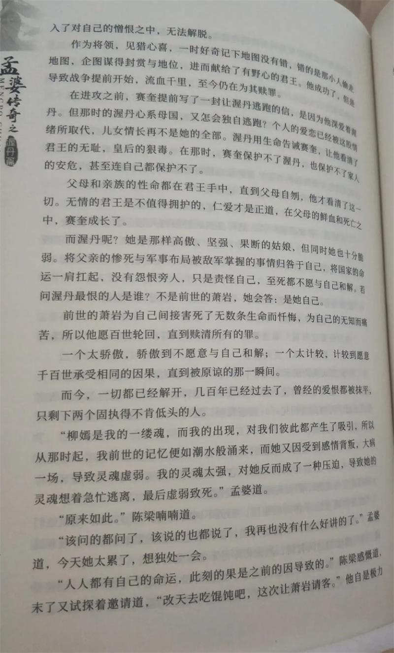 作者在书中写到渥丹与赛奎两人是一个太骄傲,骄傲到不愿意与自己和解;一个太计较,计较到愿意千百世承受相同的因果,直到被原谅的那一瞬间。几百年已经过去了,曾经的爱恨都被抹平只剩下两个固执得不肯低头的人,直到一切揭开,参透人生一起喝孟婆汤。