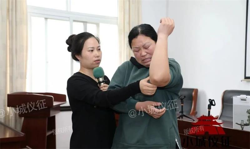 老师教了大家一些简单的通经活络小技巧,并请村民上台体验具体方法。