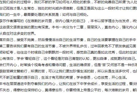 本书在层层递进中剥夺着我们的内心,让我们在放下中学会成长,享受生活的过程,看淡结果,在人生失意时不失态,得意时应保持初心,莫得意忘形,你要相信上帝是公平的,每次难熬的岁月,都是生命的馈赠。