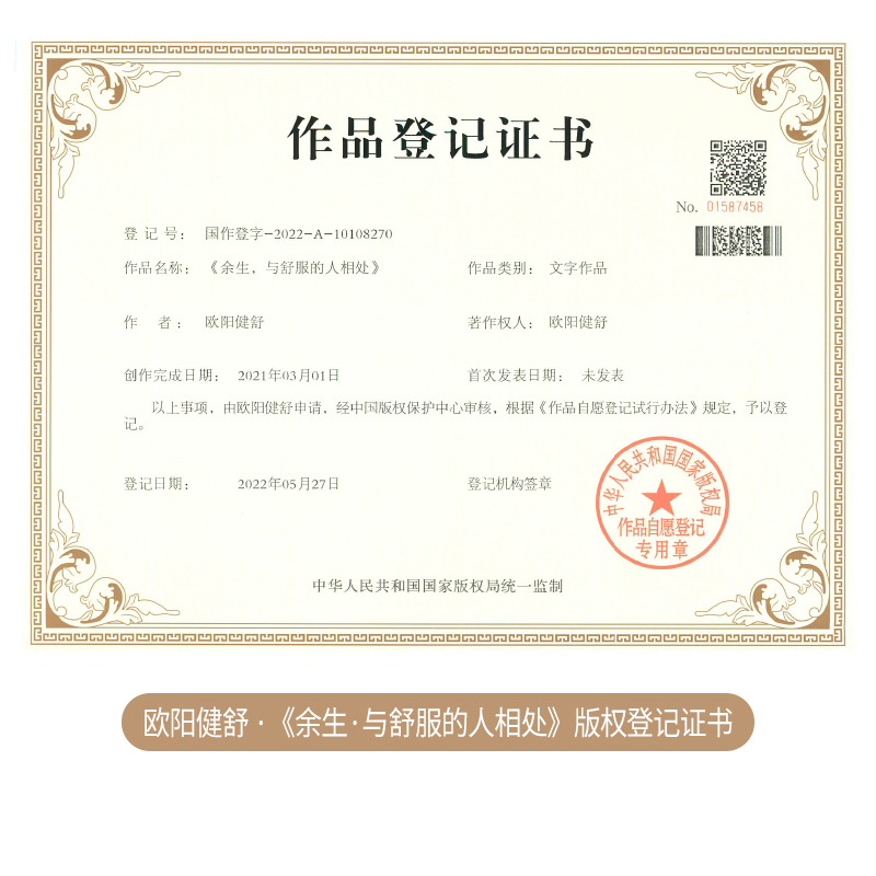 欧阳健舒:庆祝欧阳健舒著作《余生,想和相处舒服的人 在一起》成功申请作品登记证书,展示文学影响力