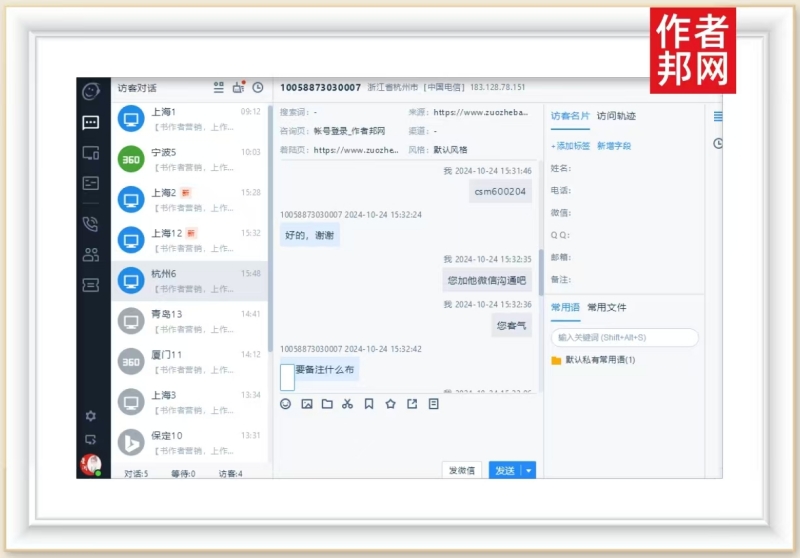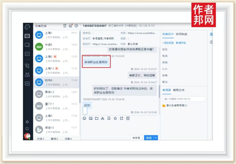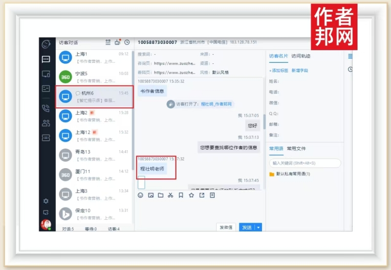 据作者邦网相关访客咨询信息页面上看,该杭州客户是通过作者邦网的程社明老师入口进入访问的。而且,是客户主动访问和咨询了作者邦网。页面更显示,客户详细地询问了有关程老师的联系方式和添加好友的备注方法。可以看出,客户希望与程老师明老师的合作意愿比较强烈。同时,也表明了客户对作者邦网和畅销书作者程老师的信任与认可。