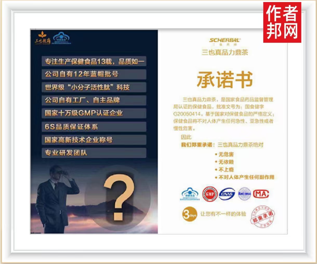 三也公司拥有国家高新技术,公司自有12年蓝帽批号,是国家十万级GMP安全卫生认证企业,只有企业自身拥有核心技术,国家才会颁发此称号。三也公司产品拥有国家认证,值得信赖,安全无副作用。三也是美国生命健康产业集团的中国区战略合作伙伴,所以具有世界级的研发 生产技术,专注生产保健食品13载,品质如一。