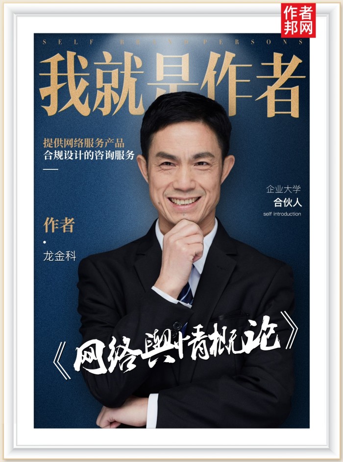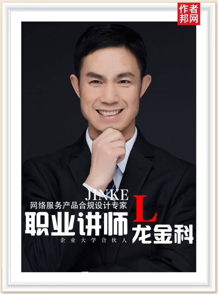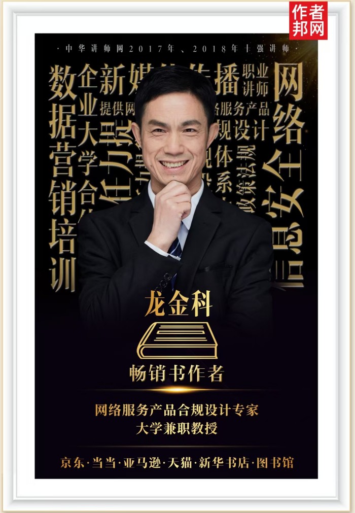 龙金科,职业讲师,大学兼职教授,网络服务产品合规设计专家 ,国内新媒体运营、网络舆情管理的培训授课专家和研究咨询专家,中华讲师网2017年、2018年十强讲师,企业大学合伙人。提供网络服务产品合规设计体系中的政策法规、信息安全、舆情舆论、网络风控、新媒体传播、数据营销的培训咨询服务。