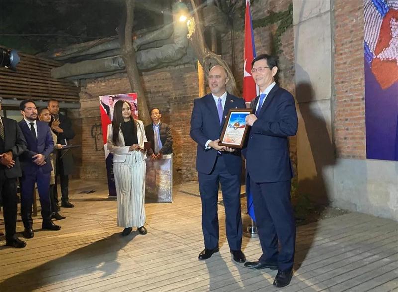 古巴驻华大使卡洛斯·米格尔·佩雷拉·埃尔南德斯向中国图书进出口(集团)有限公司执行董事张纪臣颁发“古中建交60周年荣誉证书”