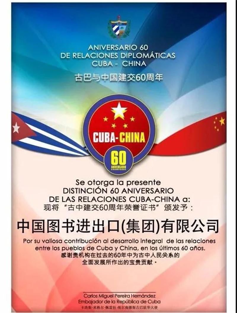 中国图书进出口(集团)有限公司荣获“古中建交60周年荣誉证书”