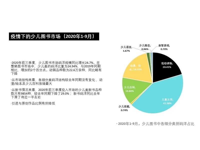 2020年前三季度,国内少儿图书市场码洋规模同比增长24.7%。新书品种数下降,新数码洋同比去年下滑一半左右。