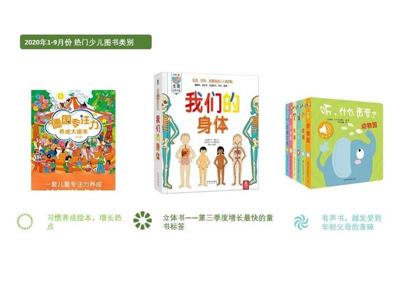 从2020年1-9月的标签云图来看,上半年受疫情影响全国各地早教机构迟迟无法正常运营,因此3月份以来,低幼读物类同比出现较大幅度的上涨。立体书、有声书、乐器书、纸板书、洞洞书等形式多种多样的早教类读物成为年轻夫妇们的哄娃神器。
