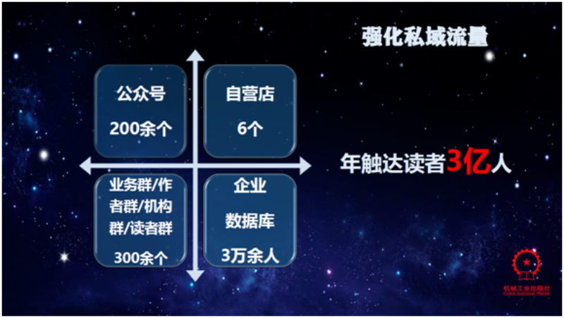 另一方面强化私域流量建设,构建属于机工社自己的私域流量池。目前,机工社共有300多个微信群、200多个公众号,粉丝达1000万,企业数据库有3万多用户,年触达读者3亿人。现在还要建立起垂直细分领域的私域流量,以便有效地应对未来的数字化竞争。此外,还要狠抓风险防控。风险无处不在,出版社要有风险意识、有实在举措做好风险管理,加强新渠道建设,促进社交媒体、微信公众号、垂直领域的渠道转化。