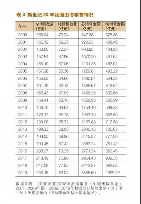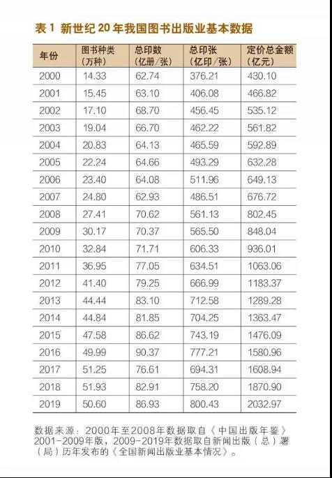 整个产业生态受到了巨大冲击,原有的发行体系进一步分化,实体书店遭受了重创,发行渠道进一步转到线上,网络渠道的话语权进一步加强。这个过程,不可逆。而让人恼火的盗版,也在拼夕夕“睁一只眼闭一只眼”之下愈演愈烈,持续地伤害行业。与从线下到线上的渠道转变所伴生的,是图书折扣已经到了触目惊心的地步。我们统计了新世纪以来20年的数据,从中可以清晰地看到,书业是如何一步步降低折扣并“自食其果”。从表1我们可以看到,2000年到2019年,图书品种从14.33万增长至50.60万,增长了2.5倍,定价总金额从430.10亿元增长至2032.97亿元,增长了3.73倍,而总印数仅仅从62.74亿册增长至86.93亿册,增长幅度只有38.55%。这组数据传递出——书越出越多,定价越来越高,单册印数越来越少。