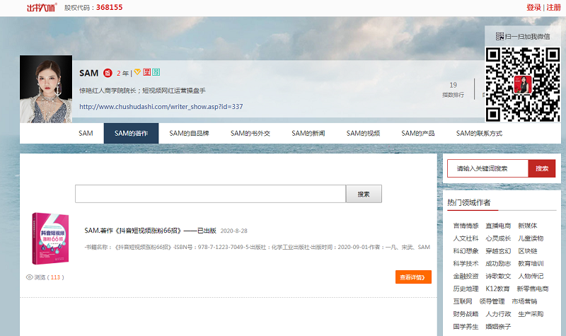 其中惊艳传媒SAM老师便是众多合作客户中的一位,她的《抖音短视频涨粉66招》一书,在出书大师网全权代理策划出版后,依托于出书大师网庞大的网络媒体资源,在全网全渠道的覆盖宣传下,SAM老师个人品牌价值全面输出,品牌效应直达人心,先后多次有陌生客户主动联系出书大师网工作人员,咨询企业辅导业务等相关事宜,出书大师网能够第一时间帮助惊艳传媒抓住用户并快速转化,使用户更好地认识惊艳传媒品牌,从而加入团队实现双赢。