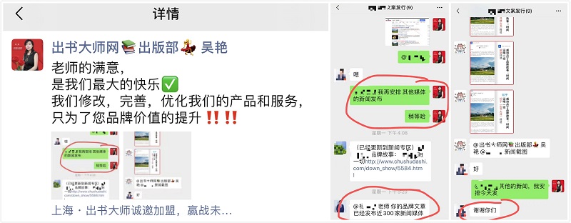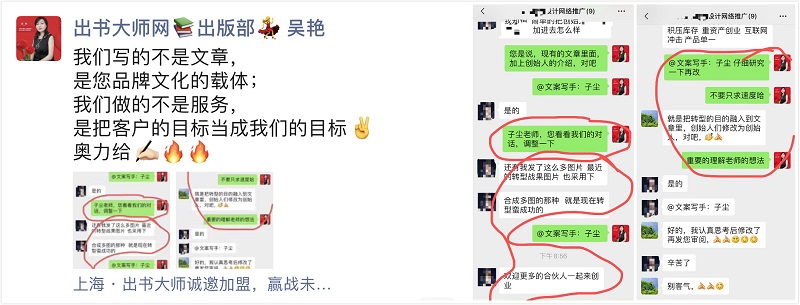 内化于心,外化于行,出版部一遍遍与客户沟通各种细节,一次次修改完善客户文案,直到客户满意,目的就是提供优质的产品和服务,最终实现客户品牌价值的大幅提升。可以说,出书大师写的不是文章,而是客户品牌文化的载体;出书大师做的也不是服务,而是把客户的目标当成自己的目标,客户满意,就是最大的快乐。