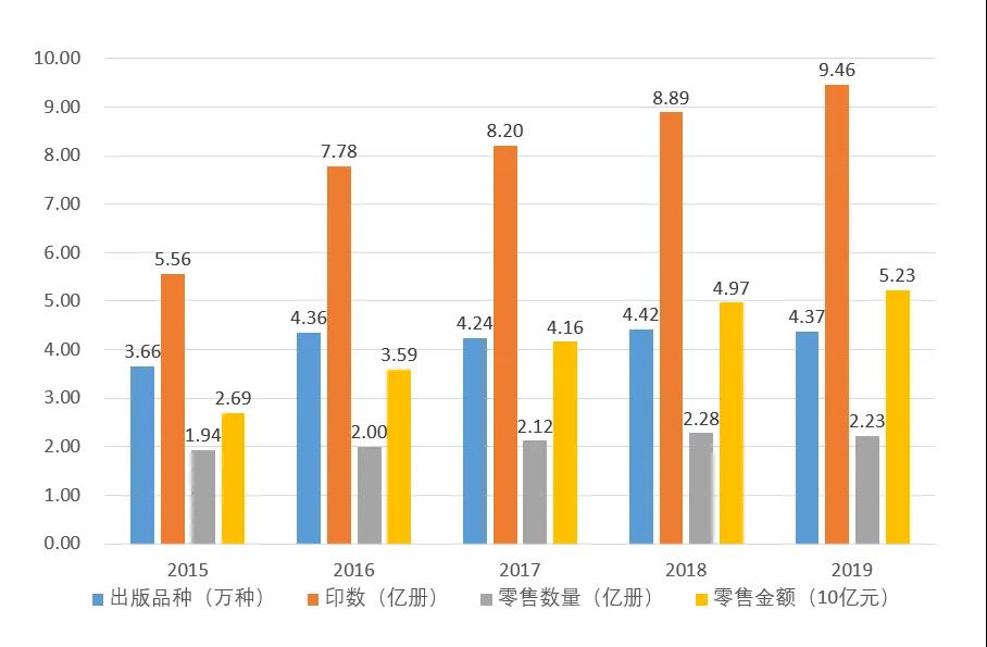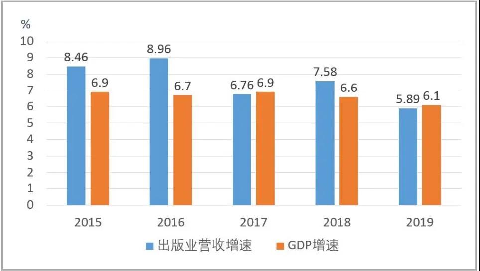 5年间,出版业营业收入的年增速分别为8.46%、8.96%、6.76%、7.58%和5.89%。与同年GDP增速基本同步,其中2015年、2016年和2018年,三年增速高于GDP增速,2017年、2019年,两年增速低于GDP增速(见图2)。