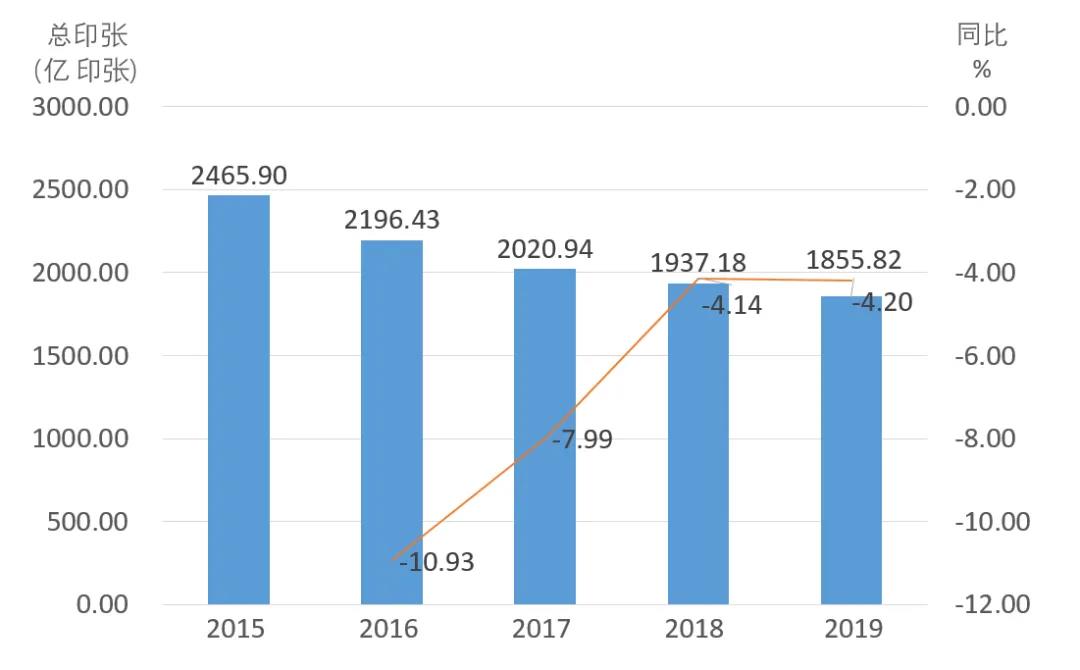 互联网阅读、移动阅读和数字出版对纸介质出版的冲击,导致纸介质出版规模的下降,在“十二五”期间已开始显现,“十三五”期间更是成为常态。已有的统计数据显示,“十二五”末以来,图书、报纸、期刊三类纸介质出版物的出版总印张持续下降,呈递减状(见图3)。从2015年的2465.90亿印张,降至2019年的1855.82亿印张,五年纸介质出版规模下降了24.74%。