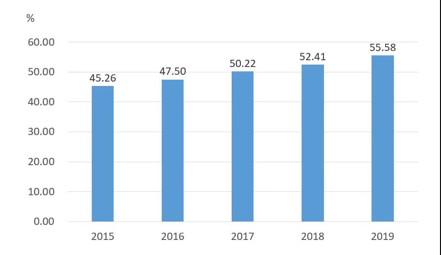 二是图书再版重印率的增递(见图6),升幅依次为2016年提升2.24个百分点,2017年提升2.72个百分点,2018年提升2.19个百分点,2019年提升3.17个百分点。“十三五”时期图书再版重印率的递增,不仅同样改变了“十二五”期间乃至相当一个时期内图书再版重印率数度徘徊、回落的状况,还把中国出版业的图书再版重印率提升至50%新阶,继之升至55%新阶。特别是2019年图书再版重印率创下年提升逾3个百分点的升速,也是近四分之一世纪以来前所未有的。