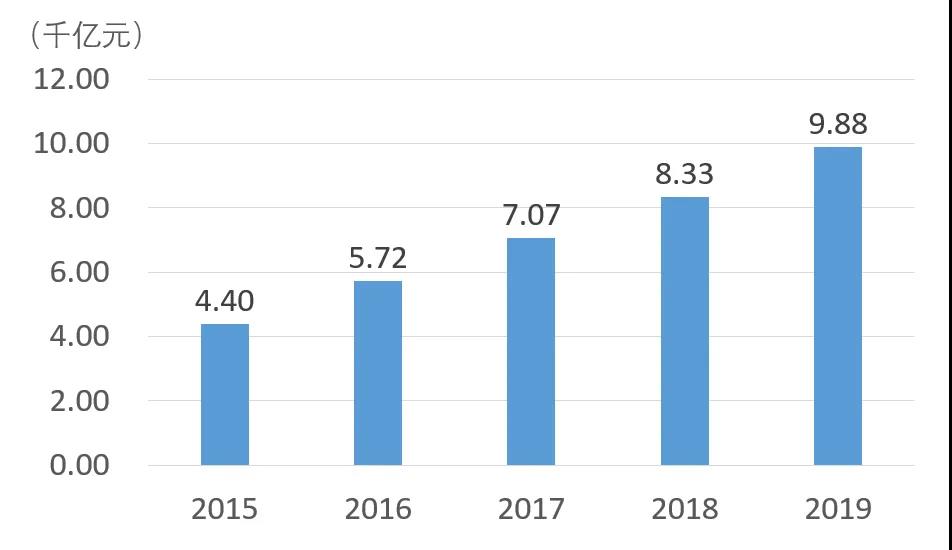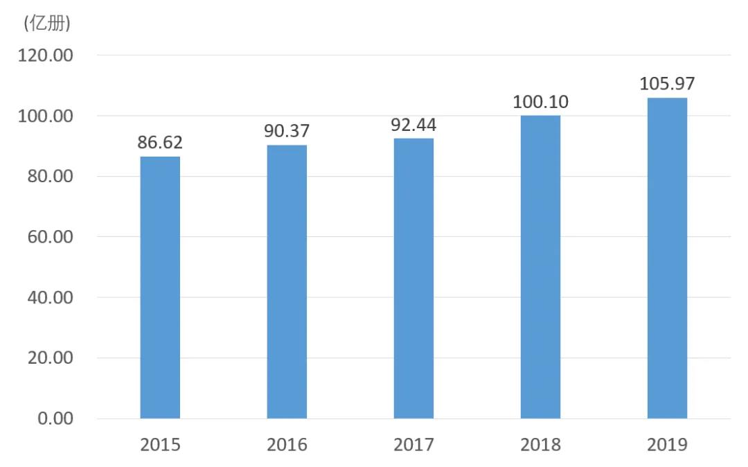 一是图书出版总印数的递增(见图5),增幅依次为2016年同比增长4.32%,2017年同比增长2.29%,2018年同比增长8.29%,2019年同比增长5.87%。图书总印数递增,是不含价格因素的出版实物量的递增,比一些隐含价格因素的指标增长更具难度。“十三五”时期的图书总印数递增的重要意义在于,不仅扭转了“十二五”期间乃至之前相当一个时期内图书总印数数度下降的状况,还把中国出版业的图书总印数提升至100亿册新阶。特别是2019年在图书出版总品种减少的情况下,图书总印数的递增是近四分之一世纪以来的首度出现,更加来之不易。