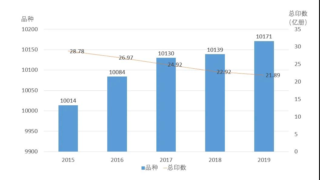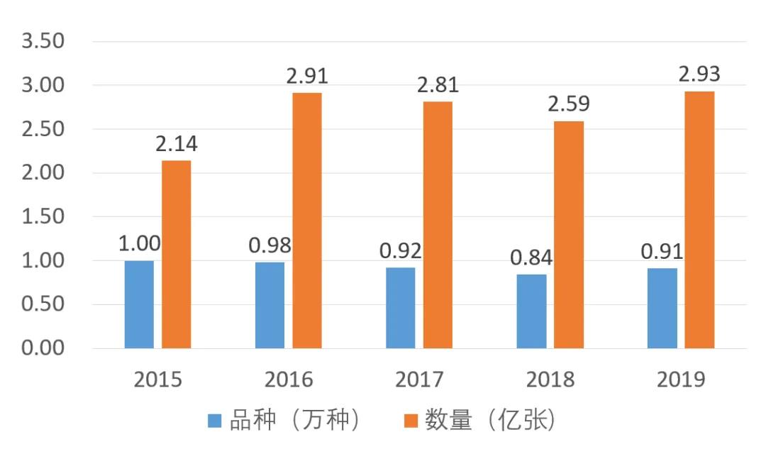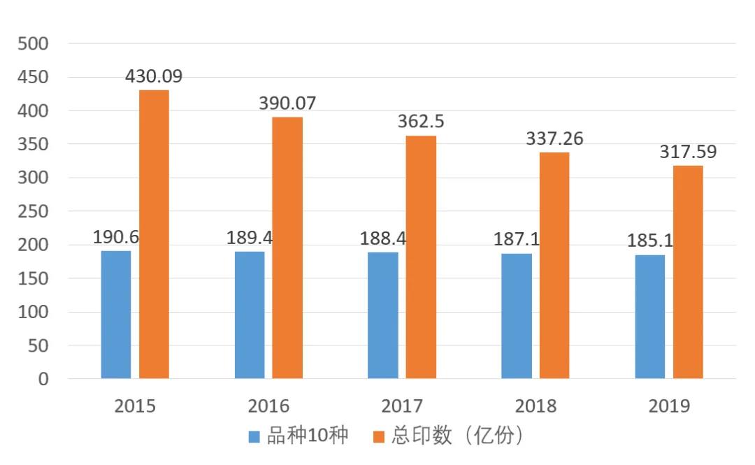 报纸出版曾为纸介质出版中的最大比重,相当一个时期中报纸出版的发展优于图书出版和期刊出版:当图书出版、期刊出版总印数数度出现徘徊、下降、回落时,报纸出版总印数始终处于递增状。直到“十二五”后期的2014年,报纸出版总印数骤然下降,且降势一直持续至“十三五”的2019年。其品种递减依次为:2016年同比下降0.63%,2017年同比下降0.53%,2018年同比下降0.69%,2019年同比下降1.07%;其总印数递减依次为:2016年同比下降9.31%,2017年同比下降7.07%,2018年同比下降6.96%,2019年同比下降14.16%。2019年报纸品种比“十二五”末下降2.89%,报纸总印数比“十二五”末下降26.16%,降幅大于期刊总印数的降幅。