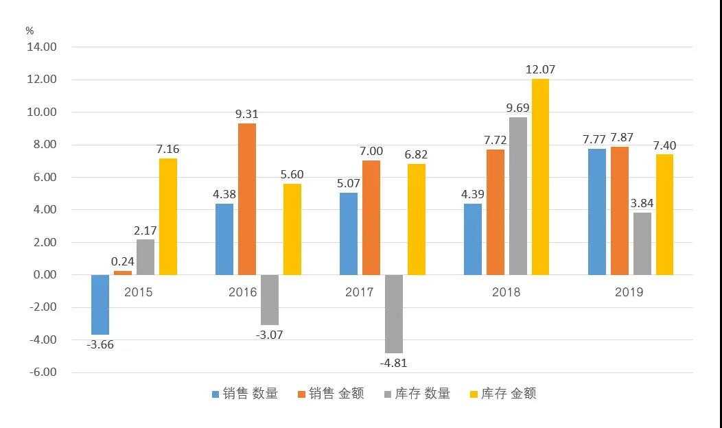 出版物库存偏高,持续增长,是相当一个时期以来困扰出版业的“窘况”。出版物库存既是出版业可持续发展之必需,又要保持适量,不致因库存过高,而占用更多流动资金,加大运营成本,影响适销品的备货。考量库存是否适量既要分析库存结构,又要科学考察库存与销售之间的关联。一般来说,年度销售增速大于库存增速是适宜的。从“十二五”末以来的销售增速与库存增速比较来看,“十三五”时期库存得到了较好管控(见图14)。“十二五”末库存数量、金额增速均大于销售数量、金额增速,进入“十三五”情况好转,2016、2017两年库存数量、金额增速均小于销售数量、金额增速,其中库存数量还两度同比下降;2018年虽有逆转,但2019年再次保持库存数量、金额增速低于销售增速。而2019年与“十二五”末比较,库存数量增长5.72%,远低于同期销售数量23.39%的增速,库存金额增长36.47%,与同期销售金额35.91%的增速基本等同。据此:“十三五”时期出版物库存可谓适量,库存增长可谓适当。