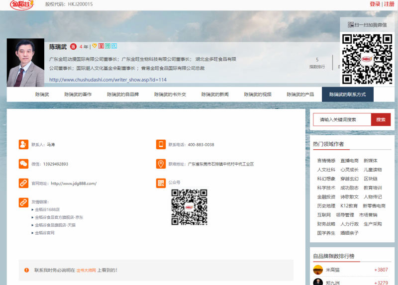 小编表示:“如今,四本畅销书作者陈瑞武先生受邀入驻诚信书作者平台,一方面能够更好地实现流量更换、对接到自身的目标客户群,更可以对外展示自身的联络方式,以收获更多的客户资源机会。”我们只需要打开出书大师网,然后搜索“陈瑞武”的关键词,并且进入陈瑞武先生的主页,就可以看到主页菜单上有“陈瑞武的联系方式”入口。点击入口后,关于诚信书作者陈瑞武老师的联系方式、二维码等信息,便会呈现在我们的眼前。这便是诚信书作者入驻的流量转换页面。