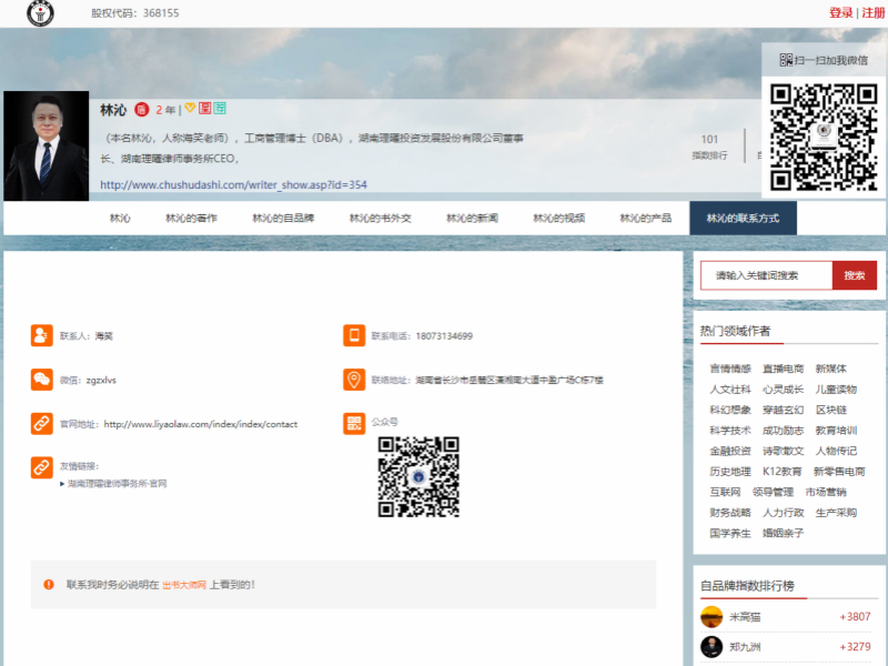 最近,畅销书作者林沁先生,受邀正式入驻出书大师网诚信书作者平台。并且开通了联系方式,同时获得了全网个人品牌影响力的全面提升。