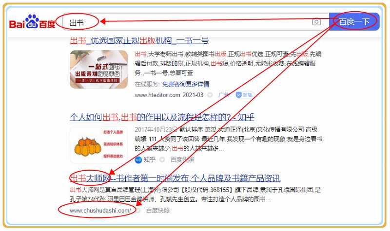 众所周知,于广大网友来说,百度是极具影响力的中文搜索引擎,致力于能够更便捷地获取信息;于出书大师网及出书客户来说,这是一个强有力的媒介支撑,通过这个平台,不仅能够起到引流,让更多的人聚焦在业务品牌板块,还能实现了关键词数据的广泛传播。只要在百度搜索引擎中输入“出书”关键词,出书大师网相关自品牌信息便在首页一览无余,真正实现了客户个人品牌流量关键词传播体系。