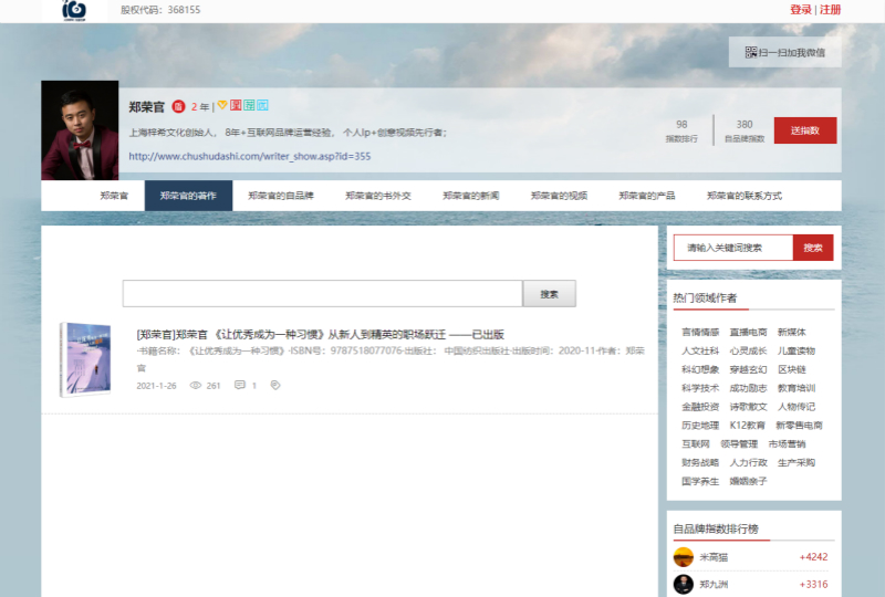 近日,上海梓希文化CEO郑荣官先生,受邀入驻诚信书作者平台。同时,开通了其联系方式,全面提升了郑先生的全网个人品牌影响力。