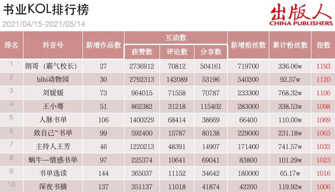 本文统计了2021年4月15日至2021年5月14日期间,包含出版社、图书公司、渠道的出版、发行机构以及书业KOL的抖音账号短视频表现情况。本期在样本数量上有所增加,“掌阅读书”“当当童书”“果麦书单”“小嘉啊”“都靓Amber”“说书哥哥”等48个抖音账号首次纳入《出版人》书业抖音短视频影响力指数的监控范围,出版、发行机构类账号达111个、书业KOL账号达75个,因此两类账号在门槛指数和排名上将产生一定波动。