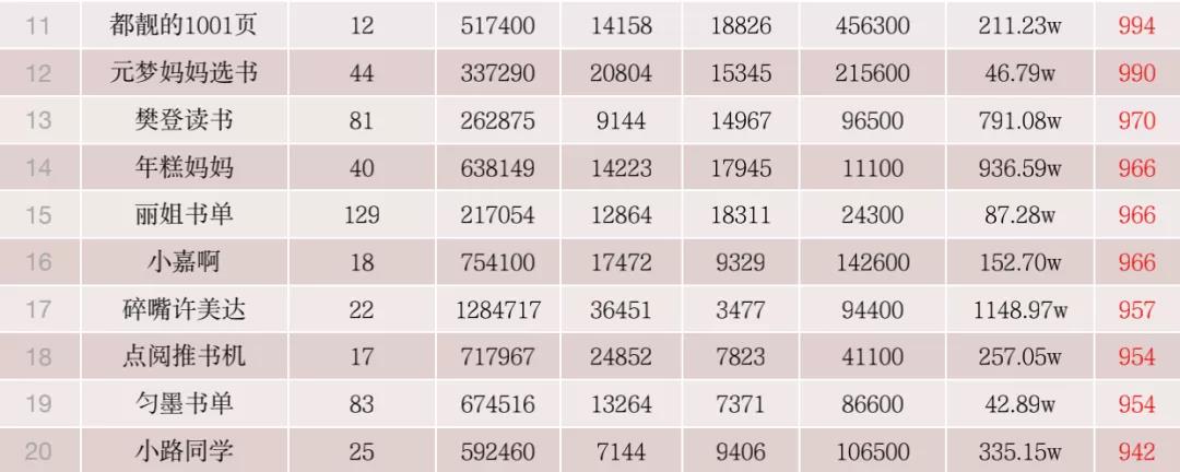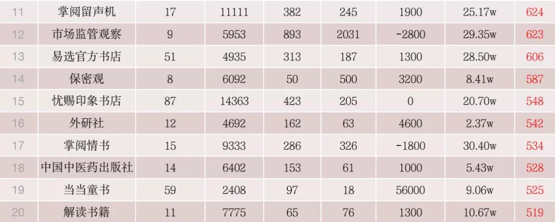 本期书业KOL的Top20门槛指数为942,远高于上期的657。在监测周期内,20强书业KOL账号共计发布作品1281个,高于上期的915个,平均发布作品64个。由于书业KOL的新增数量较多,因此整体数据较上期有较大变动。20强的名单一半以上进行了更换。