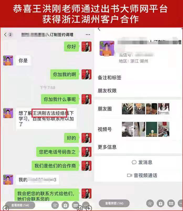 这位客户是浙江湖州的,他在出书大师网站上看到了王洪刚老师多年来秉黄岐之术、传国粹之精的新闻之后,深深地被王洪刚老师坚持弘扬传统文化、服务现代百姓的人格魅力所吸引,他果断地出手和出书大师网的顾问,展开了进一步沟通交流。期间双方商谈的十分融洽,最后这位客户希望能够在未来与王洪刚老师建立更加深入的合作伙伴关系。