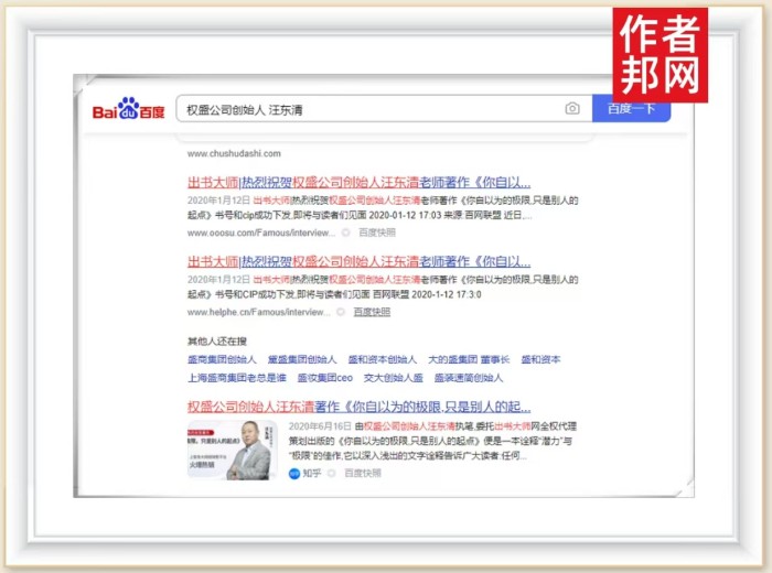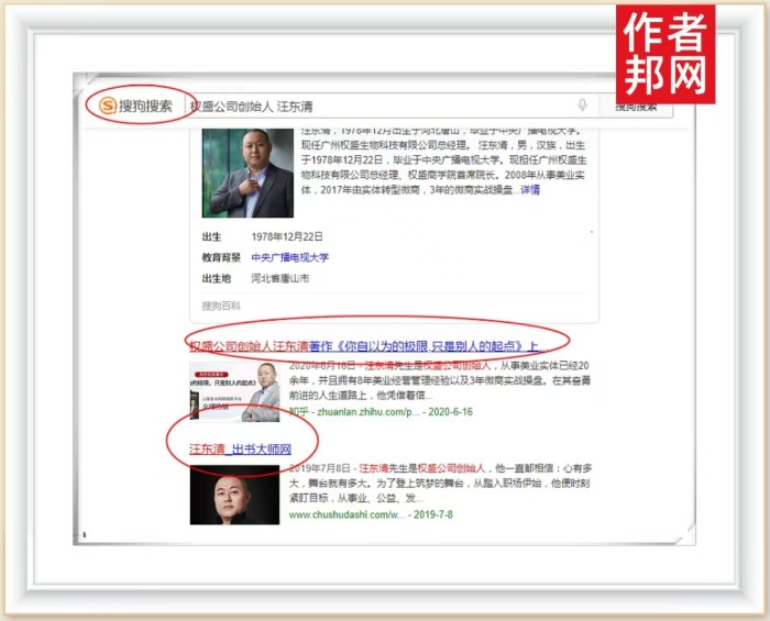 近日,依托于前期传播工作积淀,汪东清先生的自品牌成功被360、搜狗、百度平台永久收录、行业影响力再创新高。据了解,360、搜狗、百度百科三大平台在搜索结果中排名位于前列,极具权威性,只需在搜索框中输入其姓名,即在首页醒目的位置搜索到,网友只需点开链接,相关的新闻报道、个人简介、书籍信息等内容便一览无余,高效率完成自品牌流量导入,形成长期的商业回报和持久的社会影响力。