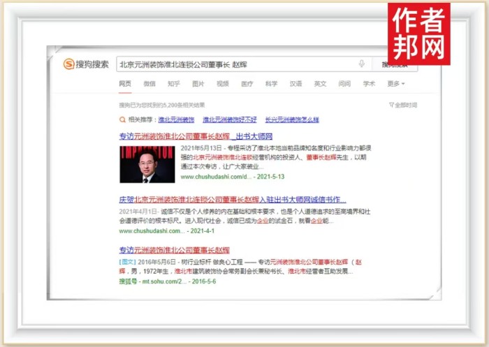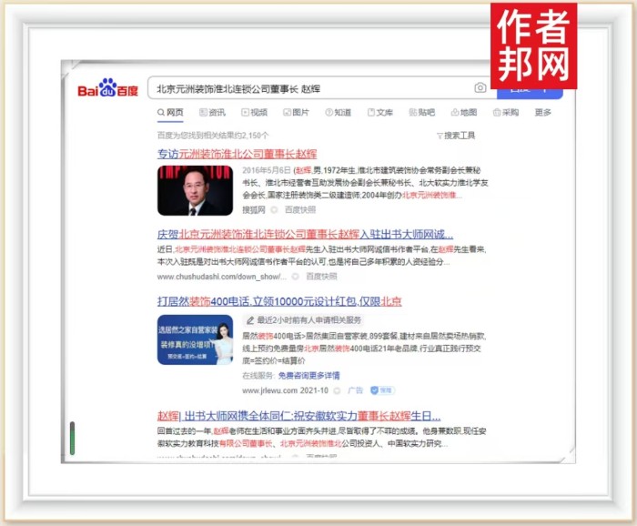 最近,依托于前期传播工作积淀,赵辉先生的书作者营销网站成功被360、搜狗、百度平台永久收录、行业影响力再创新高。大众只需要打开百度搜索页面,在搜索框中输入“赵辉”这个关键词,点击搜索框中的搜索按钮,关于赵辉先生的相关新闻报道、个人简介、书籍信息等内容便即刻呈现,这对其个人品牌价值提升有着显著效果。