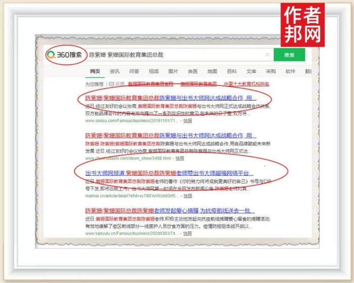 经相关企业媒体的运营与推广,以陈紫姗女士为核心的资讯报道进入360、搜狗、百度等网络平台,与之有关的新闻报道相继出现,需要了解相关信息只需在平台页面输入“陈紫姗”关键词,便可读取新闻内容以及品牌信息,不仅加快了品牌流入市场速度,而且增加了平台流量,为提高陈紫姗女士的个人品牌影响力带来了便捷。
