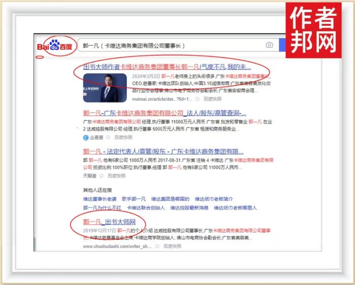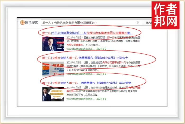 近日,卡维达商务集团有限公司董事长郭一凡书作者关键词置顶360、搜狗、百度平台,不仅带来了流量内容,也形成了以郭一凡先生为核心的流量品牌IP,粉丝读者只需在平台界面搜索“郭一凡”相关关键词,便会迅速跳转页面连接品牌信息,至此郭一凡先生的行业知名度与品牌影响力飞速提升。
